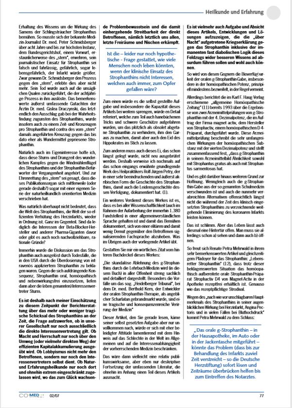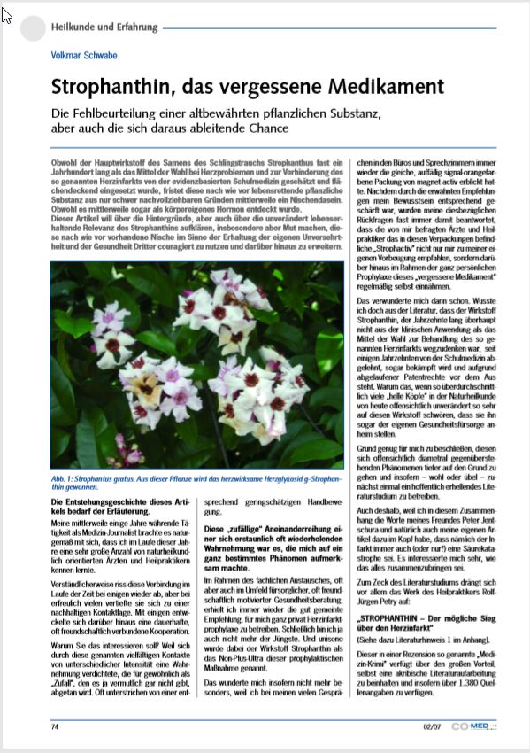 Erhaltung des Wissens um die Wirkung des Samens der Schlingsträucher Strophanthus bemühen. So musste sich der bekannte Medizin-Journalist Dr. med. Peter Schmidsberger über acht Jahre und bis zur höchsten Instanz, dem Bundesgerichtshof, einem Vorwurf, erstaunlicherweise des „stern“, erwehren, sein journalistischer Einsatz für Strophanthin sei falsch und fahrlässig, gefährlich, sogar lebensgefährlich, der Infarkt würde größer. Zwar gewann Dr. Schmidsberger den Prozess gegen den „stern“, erlebte dies aber nicht mehr. Sein Tod wurde auch auf die unsäglichen Qualen zurückgeführt, die der achtjährige Prozess in ihm auslöste. Das bemerkenswerte äußerst umfassende Gutachten der Ärztin Dr. med. Gislea Draczynski, das letztendlich den Ausschlag gab bei der Wahrheitsfindung zugunsten des Strophanthins, wurde insofern auch zu einem Zeit- und Kronzeugen pro Strophanthin und contra des vom „stern“ damals angeführten Kreuzzug gegen das bis dato eher als Wundermittel gepriesene Strophanthin.