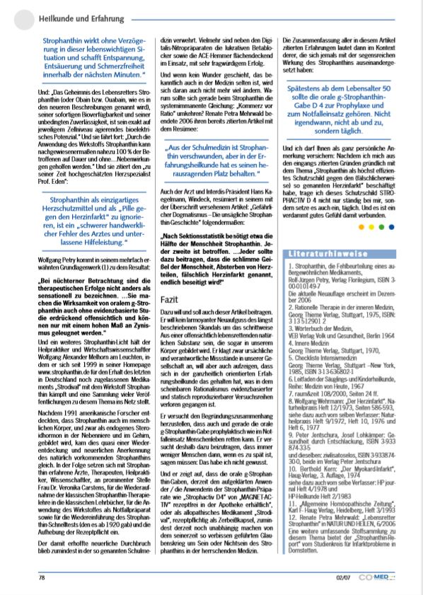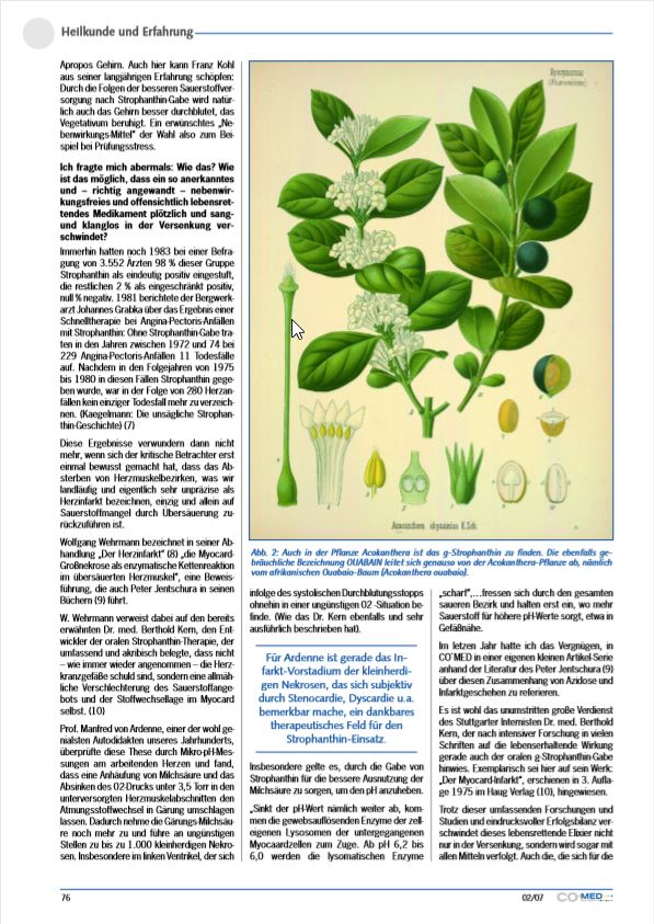 < >Berthold Kern: „Der Myokard-Infarkt“, Haug-Verlag, 3. Auflage, 1974 siehe dazu auch vom selbe Verfasser: HP journal Heft 4/1978 und HP-Heilkunde Heft 2/1983„Allgemeine Homöopathische Zeitung“, Karl F- Haug Verlag, Heidelberg, Heft 3/1993Renate Petra Mehrwald: „Lebensretter Strophanthin“ in NATUR UND HEILEN, 6/2006 Eine weitere umfassende Stoffsammlung zu diesem Thema bietet der „Strophanthin-Report“ vom Studienkreis für Infarktprobleme in Dornstetten.